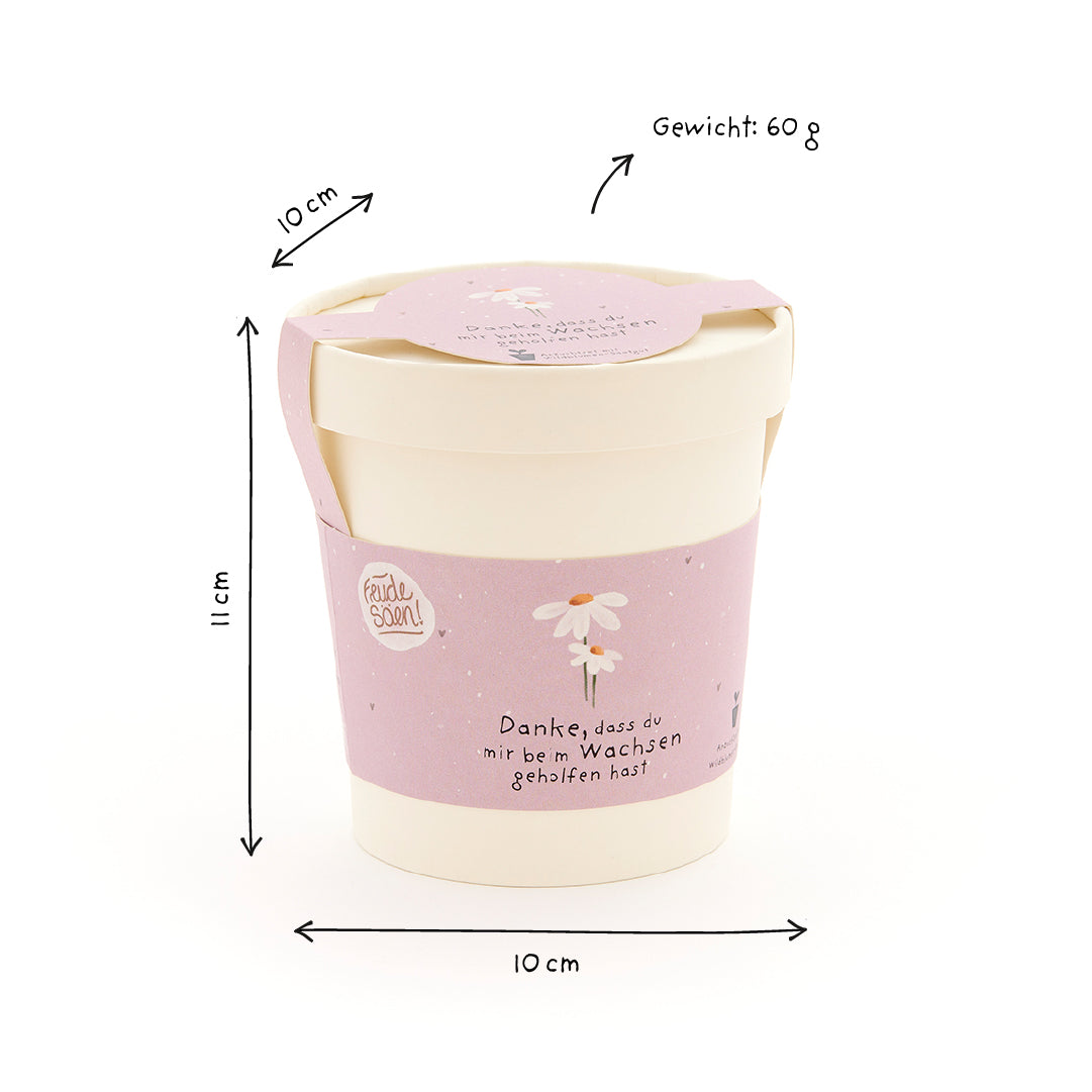 Dieses besondere Anzuchtset für Wildblumen ist eine liebevolle Geste an Menschen, die uns begleitet, unterstützt und inspiriert haben. Der charmant gestaltete Becher mit der Aufschrift „Danke, dass du mir beim Wachsen geholfen hast“ sagt auf blühende Weise: Du warst wichtig für mich.