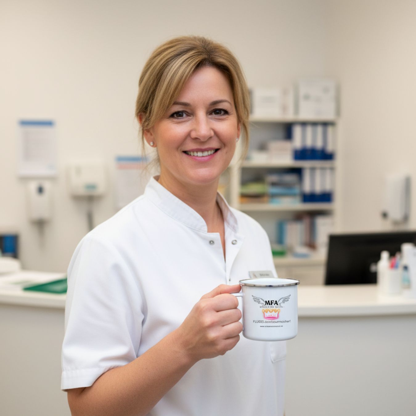 Dieser wundervolle Becher spiegelt mit einem liebevoll gestalteten Design, den Teamgeist und die Vielseitigkeit von MFAs wider und ist damit das perfekte DANKEschön. Wertschätzung für kurze Pausen zwischen Blutabnahme, Telefonklingeln und Patientenberatung.