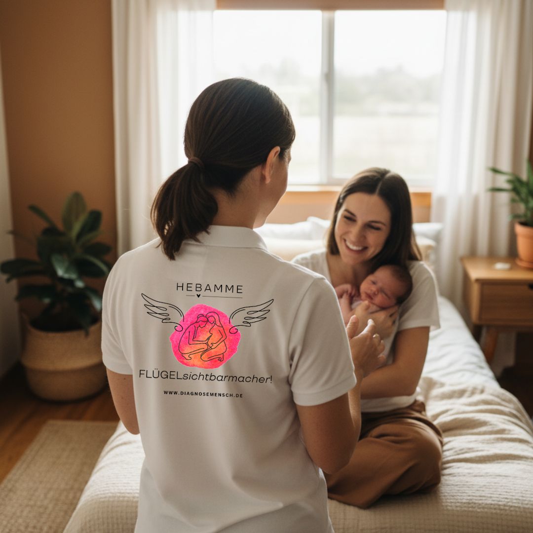 Mit diesem wundervollen Polo Shirt werden sie immer wieder an ihre Einzigartigkeit erinnert. Sieht stylisch aus und bleibt in Form, wenn es mal wieder drüber und drunter geht. Die Flügel stehen für ihre Kraft, Fürsorge, Fachkompetenz und Ruhe, die sie den werdenden Eltern geben. In der Mitte: Zwei Hände – sanft und stark – die den Bauch einer werdenden Mutter halten. Ein Symbol für Geborgenheit, Vertrauen und den Beginn eines neuen Lebens.